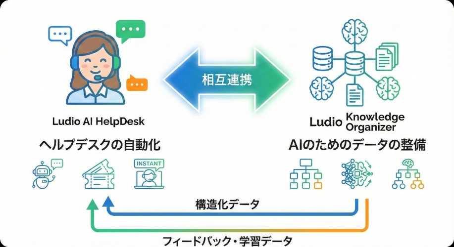 Ludio AI HelpDeskとKnowledge Organizerは、AIを利用し、ヘルプデスク業務を大幅に自動化します。社内ナレッジの自動整備、問い合わせ対応や資料作成の自動化はお任せください。